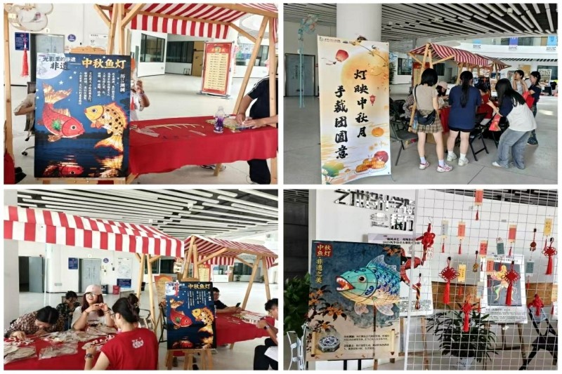 • 金秋送爽,丹桂飘香。10月8日,艺术设计学院“灯映中秋月・手裁团圆意”中秋主题灯会在A11教学楼一楼大厅温情启幕,为校园增添了浓厚的节日氛围。活动筹备阶段,学院学生会成员提前抵达现场,有序开展场地布置工作。同学们分工协作,将一盏盏精心准备的灯笼悬挂于大厅四周。暖黄色的灯光透过绘有中秋元素的纸面,晕染出温馨雅致的节日气息。部分成员细致粘贴灯谜纸条,将涵盖中秋文化与诗词常识的谜题整齐排列于展板之上。同时,盲盒交换区、手绘灯笼区及“中秋家书”书写区也逐一布置到位,各类物料齐备,细节周到,展现出组织工作的细致与用心。(图为活动现场布置)   活动现场气氛热烈,四项特色环节吸引众多同学沉浸参与。“猜谜得礼”区前,同学们或凝神思索,或踊跃作答,答对者喜悦领取月饼及学院定制纪念品;“盲盒交换”区惊喜不断,同学们在互换祝福与手作中传递温暖,欢声笑语此起彼伏;“中秋家书”环节温情流露,学子们伏案执笔,将思念与祝福落于纸笺,装入信封,寄往远方;手绘灯笼区则成为创意展示的舞台,大家结合专业所学,以玉兔、明月、