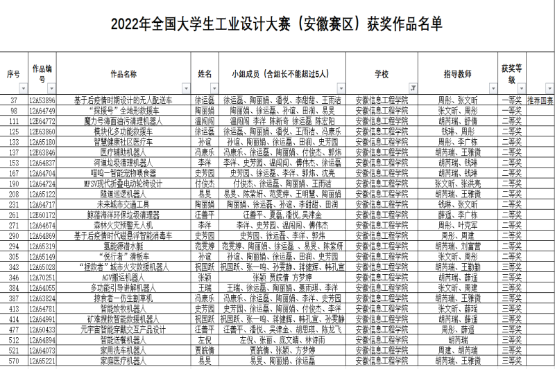 本网讯 由安徽省教育厅主办、安徽工业大学承办的2022全国大学生工业设计大赛安徽赛区评审于7月中旬举行。此次安徽赛区共收到合肥工业大学、安徽工程大学等33所高校推荐省赛参赛作品1065件作品。在安徽信息工程学院艺术设计学院全体师生的不懈努力之下,经大赛专家委员会对参赛选手竞赛成绩的评定及公示,今年艺术设计学院共获得一等奖2项(其中一个推荐国赛),二等奖14项,三等奖10项,总计26项,获奖率(获奖作品数与学院参赛名额的比值)达到65%,等级奖数量和质量较往届有了较大幅度提升。