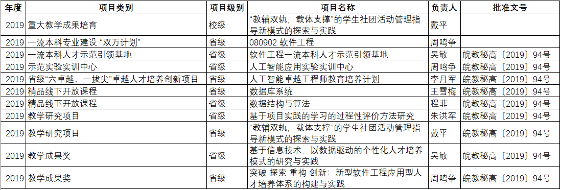 序号项目编号项目名称项目类别负责人级别或等级12021sx067产教融合背景下的新型软件工程专业建设与实践“四新”研究与改革实践项目王啸楠省级22021cyxy040安徽信息工程学院特色示范软件学院特色示范软件学院周鸣争省级32021cyxy041安徽信息工程学院人工智能产业学院现代产业学院吴敏省级42021jxtd125计算机科学与技术专业教学团队教学团队岳丽华省级52021jyxm0644基于4L4D项目化教学体系下的课程项目教学考核评价方法的探究与实践——以《面向对象程序设计》课程为例教学研究项目刘华敏重点62021jyxm0645基于小组研讨式教学法的《人工智能导论》课程建设与实践教学研究项目高超重点72021jyxm0657基于博思平台的《数据结构与算法》线上线下混合式教学模式改革研究教学研究项目佘星星一般82021kcszsfkc199C语言程序设计基础课程思政示范课程周鸣争,王雪梅省级92021kcszsfkc203Java语言程序设计基础课程思政示范课程周鸣争,朱洪军省级
