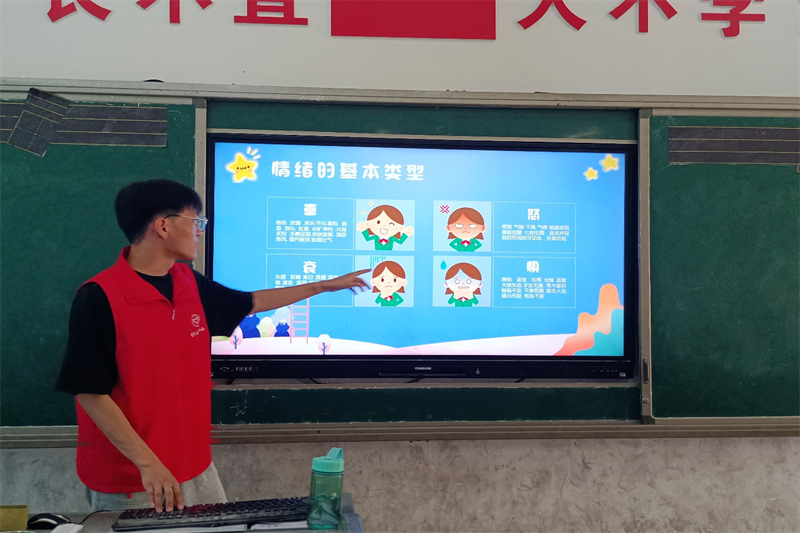 本网讯 为聚焦乡村小学心理健康教育,关注乡村小学生心理健康,2022年7月8日,安徽信息工程学院青年志愿者协会“七彩假期”支教团博雅分队在校团委的指导下,赶赴阜阳市阜南县于集乡程楼小学,开展“心理健康进校园”主题支教活动。(图为志愿者带领孩子们学习心理健康知识)课程伊始,志愿者向孩子们展示了生活中会出现的各种情绪,从积极情绪和消极情绪两个方面分别介绍了情绪对自身产生的不同影响。上课过程中,志愿者用温和的话语耐心向孩子们讲述了心理健康在学习生活和人际交往中的重要性,并教授他们控制情绪的方法。孩子们也将自己在学习和生活中所遇到的问题和困惑向志愿者进行倾诉,在志愿者的循循善诱和积极引导下,孩子们的心结也逐渐打开。课程尾声,志愿者与孩子们一起观看心理健康动画视频,跟着动画学习一些深呼吸、冥想等缓解情绪的小技巧,轻松愉快的课堂氛围使得每个孩子的脸上都洋溢着幸福的笑容。(图为小朋友认真听志愿者讲课)(图为小朋友回答志愿者的提问)推开心灵之窗,绽放生命之花。安徽信息工程学院“七彩假期”支教团聚焦乡村小