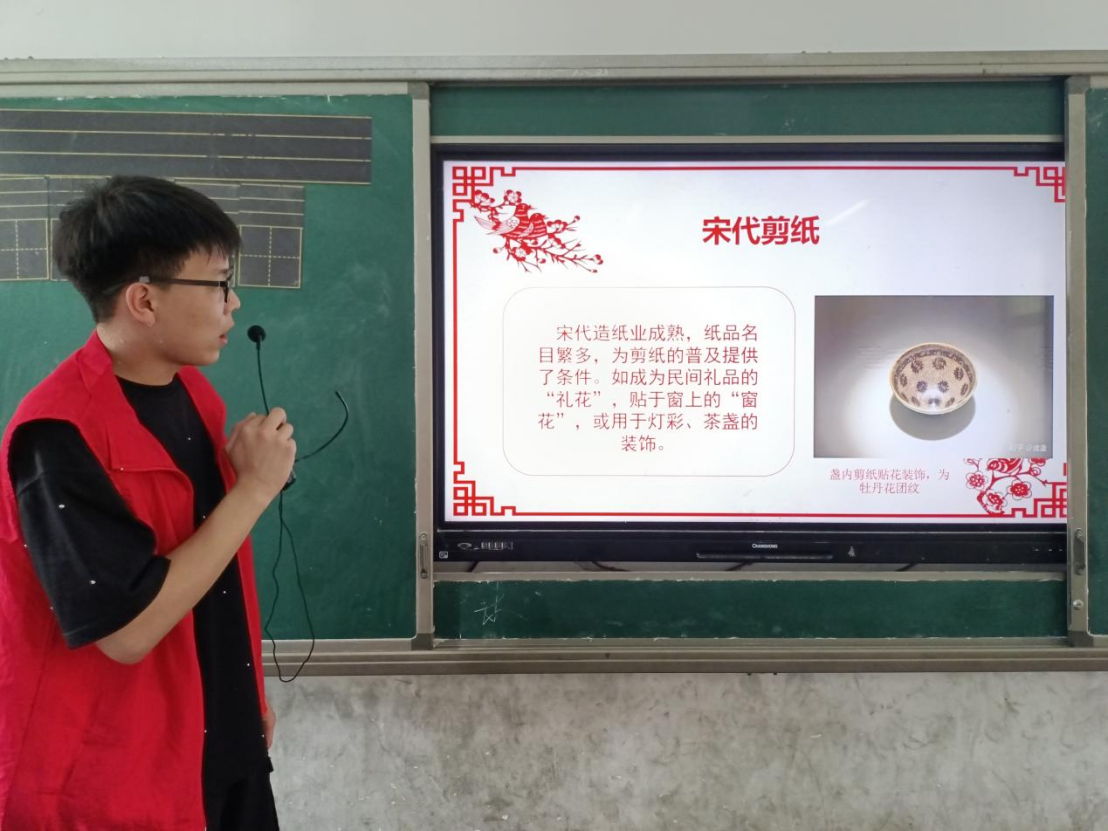 本网讯 为弘扬中华民族传统剪纸文化,培养儿童的动手能力、反应能力和创造力,安徽信息工程学院青年志愿者协会“七彩假期”支教团博雅分队在校团委的指导下,于2022年7月9日上午赶赴阜阳市阜南县于集乡程楼小学,开展以“传统剪纸助成长”为主题的支教活动。(图为志愿者为孩子们介绍古代各类剪纸)本次课程主要以剪纸的起源、历史发展和日常应用三大部分展开讲述。课程伊始,志愿者为孩子们依次展示了十二生肖的剪纸手工艺品,激起了孩子们对剪纸的极大兴趣和好奇心。紧接着,志愿者向孩子们介绍了剪纸的起源——阿斯塔那古北朝墓群团花剪纸图。随后,志愿者为小朋友们介绍了由古至今我国剪纸艺术的发展演变,并以唐、宋和明清时期为例着重介绍,展示出了剪纸手工艺术的古典之美和广泛应用。最后,志愿者将传统剪纸手工艺术与现代生活中的服装设计、建筑设计和工艺品设计相结合,逐次展示了旗袍、世博会波兰馆、灯笼、皮影等图片。课堂尾声,志愿者教授孩子们两种不同的剪纸方法,孩子们满怀热情,迫不及待地动手进行创作,轻松愉快的课堂氛围,使得每个孩子的