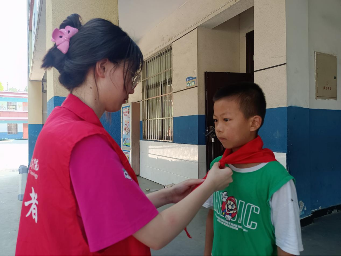 本网讯 为助力少年儿童健康成长,培养新时代少先队员的爱国情怀。2022年7月15日,安徽信息工程学院“七彩假期”支教团博雅分队在校团委的指导下,于阜阳市阜南县于集乡程楼小学,开展安徽省暑期三下乡社会实践“少先队实践营”专项活动。(图为志愿者为少先队员系红领巾)活动伊始,志愿者们亲自为每位少先队员佩戴鲜艳的红领巾,并带引他们抵达操场举行升旗仪式,伴随着国歌声起,少先队员们神情坚定,歌喉嘹亮,分外动人。紧接着,志愿者向他们讲述了红领巾的来历和正确的佩戴方法。仪式结束后,志愿者带领他们返回教室,通过播放安徽省少工委办公室录制的《你好,少先队》等视频片段,介绍了“六知六会一做”等相关知识,教授孩子们要勤奋学习、强健体魄,不负党和人民对青少年的殷切希望。随后,志愿者为少先队员们播放了《我的梦·中国梦》、《推出胜利》、《铁血将军彭雪枫的家书》、《戎装白马唤拂晓》等8段少先队实践营教育视频。视频中,从北国到南疆、从深海到太空、从过去到未来,展现了一幅宏大壮阔的“十四五”蓝图。革命时期,人民群众将星星之